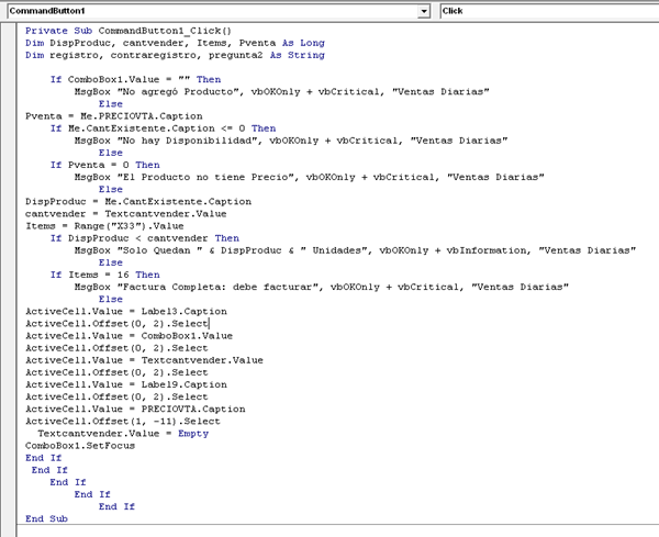 Tengo un código que carga un Userform con datos de una hoja excel, a través de un combobox, lo que necesito es que mi botos de agregar a factura, revise que el producto ya este en factura y de ser así le le diga en msgbox que ya esta en factura el producto y si desea se le suma la cantidad a la que ya tiene en factura, esto para evitar repetir artículos en factura, ademas mi código solo descuenta de inventario cuando se factura no cuando se carga, es decir también una vez que sume debe revisar otra vez si hay existencia.