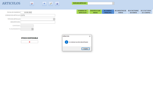 En este formulario me gustaría saber al momento de ingresar un código de articulo que ya existe me avise y me muestre los datos del código articulo que esta repetido. Al momento anotar el código de articulo me sale el mensaje luego de aceptar me agrega todos los campos del articulo que ya existe pero el campo del código del articulo me lo deja en blanco, que puede ser