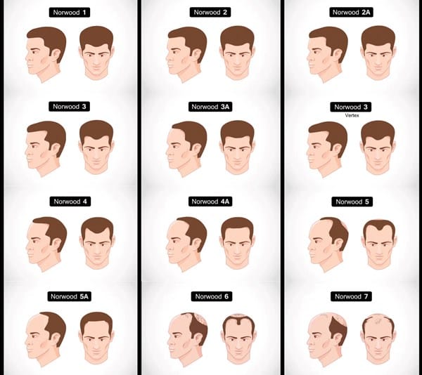 Existe una forma de medir la clásica alopecia androgenética -AGA-, (la más común/frecuente), en escalas o niveles, se llama Hamilton-Norwood y funciona así,