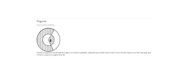 Estimados pregunto si al siguiente problema de área sombreada ¿Calcular la superficie sombreada de la figura, en metros cuadrados, sabiendo que el radio menor mide 13 mts, el radio mayor es un 30% más largo que el menor y abarca un ángulo Beta de 34º? .