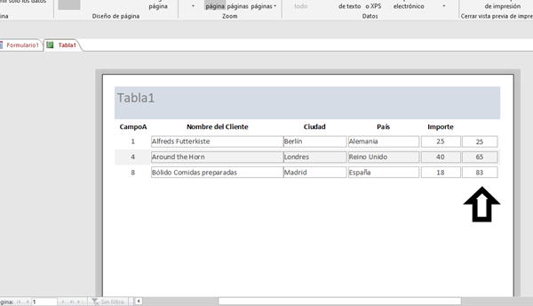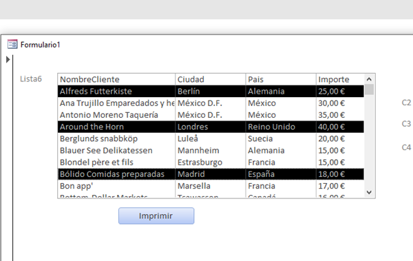 El cuadro de lista tiene 5 columnas, la primera es la de Idcliente, a la que le doy un ancho de 0 cm para que no se vea pero es la columna dependiente. Cuando pulso el botón, primero pasa a la tabla Tabla1, al campo CampoA, los valores de los idcliente que he elegido. Luego abre el informe Tabla1 sólo con esos Idcliente.