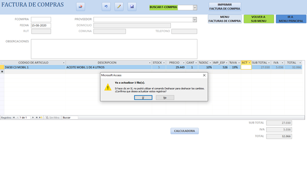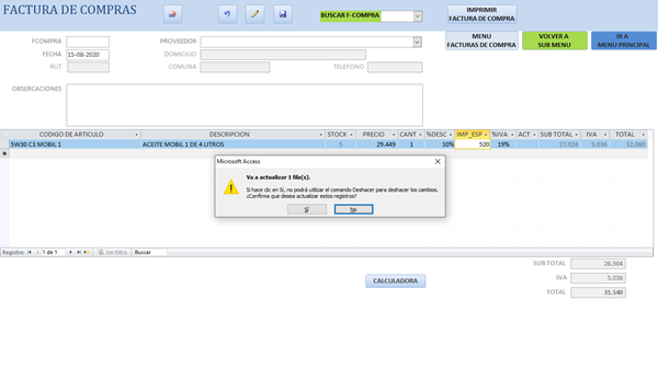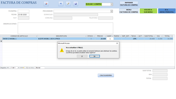 If MsgBox("ESTA BIEN LA CANTIDAD INGRESADA", vbYesNo + vbQuestion, "ESTAS A PUNTO DE ACTUALIZAR EL STOCK") = vbYes Then