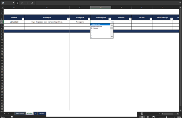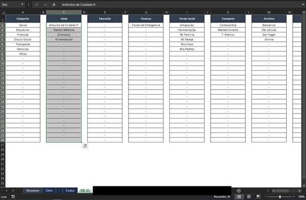 Tengo un archivo, el mismo lo cree para ingresar mis gastos fijos. Se basa en categorías, subcategorías y demás datos para poder tener el control de mis gastos. Lo que necesito es, que cuando esté llenando la tabla, y ponga una categoría, cuando vaya a la celda del lado, automaticamente me de las subcategorías correspondientes. Tengo otra hoja en donde, tengo una base de datos prácticamente, les puse un nombre a cada rango de celdas para facilitar el proceso, cada nombre se compono de 3 letras, es decir, una abreviación.
