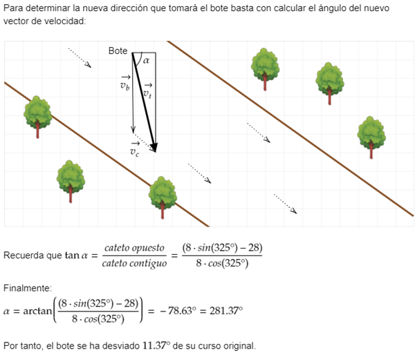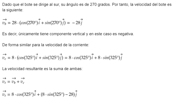 Un bote se dirige al sur a 28km/h. Si la corriente del rio es de 8km/h a 325 (grados)