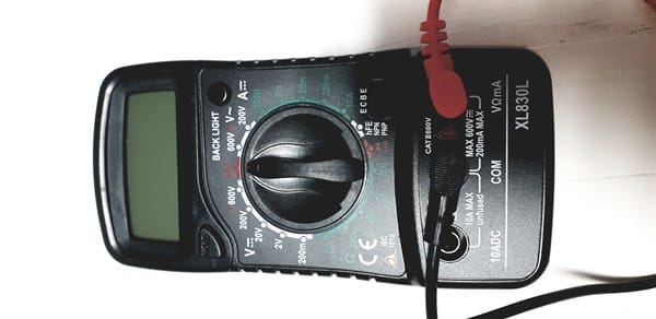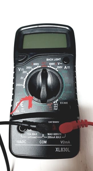 1) El múltimetro ha de estar en la posicion que te indico en la siguiente imagen. Al juntar las puntas de los dos terminales de medición (rojo y negro) debería de sonar un pitido y la imagen de medición en la pantalla debería de ser "0" (cero).