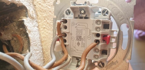 Los dos cables marrones conectados cada uno a los dos bornes blancos del conmutador normal.