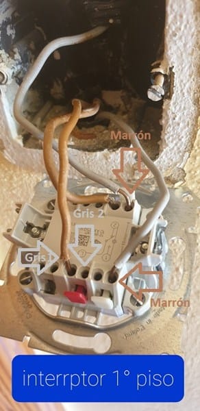 - Sólo pita el gris de la 2ª planta que viene de abajo. Es decir, al interruptor de la 2ª planta llegan por arriba un cable gris, y por abajo 2 marrones y un gris ; éste gris es el que pita.