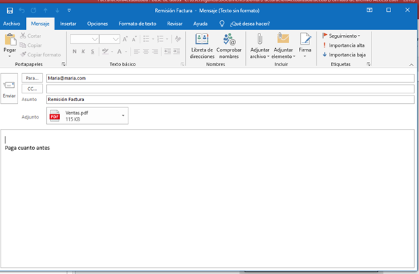 DoCmd.SendObject acSendReport, "Facturas", "PDFFormat(*.pdf)", "" & Me.Email & "", , , "Remisión Factura", "Paga cuanto antes", True