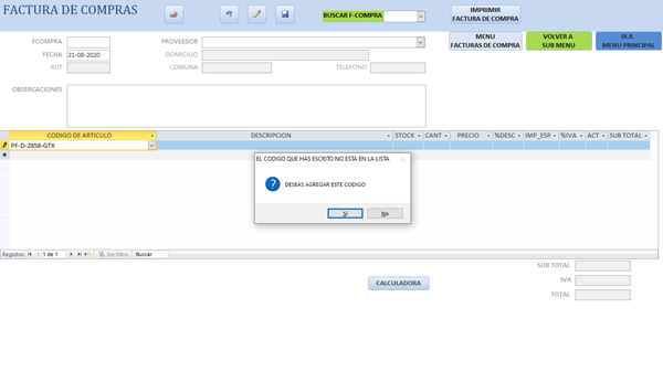 Quería pedirles si me pueden ayudar con este código vba que tengo el cual me avisa cuando ingreso en el campo CODIGO_ARTICULO el código de un producto que no esta en la lista de artículos comprados.