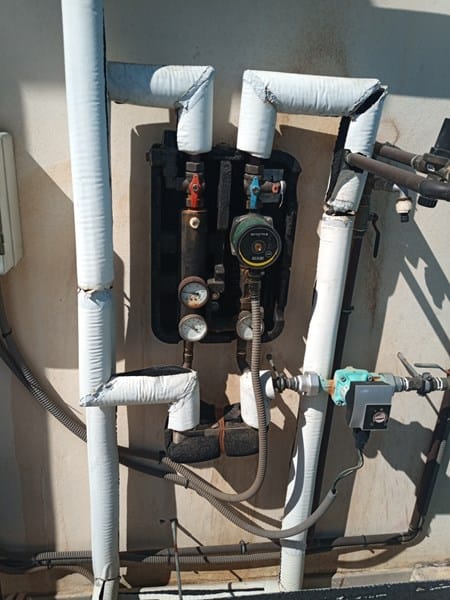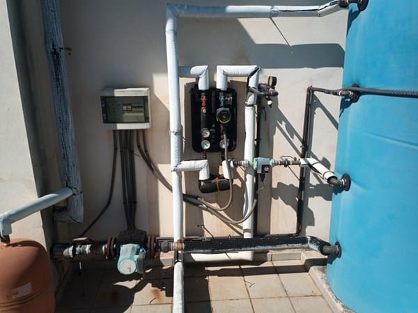 La bomba de recirculacion de los captadores está después del intercambiador. Se ha probado que la bomba funciona y que por el intercambiador circula el agua. Si abro el circuito en la salida de la bomba si sale en agua caliente pero una vez que cierro el circuito no recircula el agua caliente.