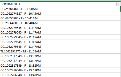 El requerimiento consiste en poder separar en columnas independientes el numero de cédula el sexo la hora, debido a que toda la información esta una única celda y el la longitud de cada registro varia se hace un poco complejo