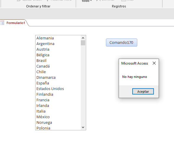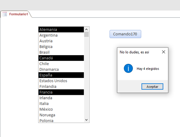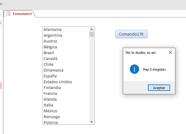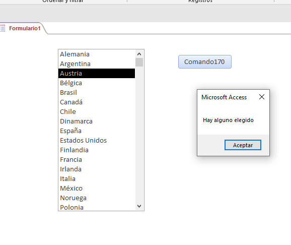 Cuando abro el formulario y cargo el cuadro de lista, oprimo el botón de validación y me indica que no existe ningún dato seleccionado, luego seleccionó alguna fila y vuelvo a dar click en el botón y me indica que si existe un registro seleccionado.