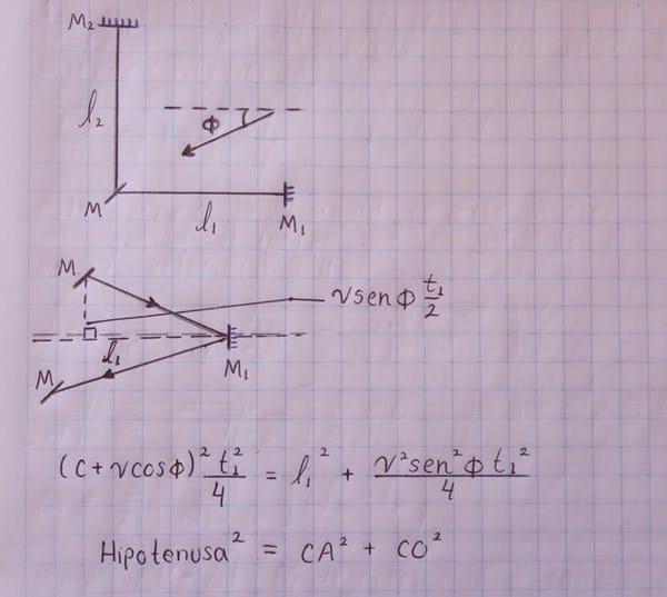 $$\begin{align}&t_1 = \dfrac{2l_1}{\sqrt{(c+vcos\phi)^2-v^2sin^2\phi}} + \dfrac{2l_1}{\sqrt{(c-vcos\phi)^2-v^2sin^2\phi}}\end{align}$$Para llegar a esta expresión considere que el interferómetro se desplaza hacia la izquierda y hacia abajo por \vec{v}, la velocidad vertical no cambia para el brazo l1 pero la velocidad horizontal para este brazo primero es c+vcos\phi y cuando el rayo se refleja en el espejo la velocidad horizontal cambia a c-vcos\phi, lo demás lo deduje al usar teorema de Pitágoras con las distancias del triangulo que se forma por el desplazamiento del sistema.