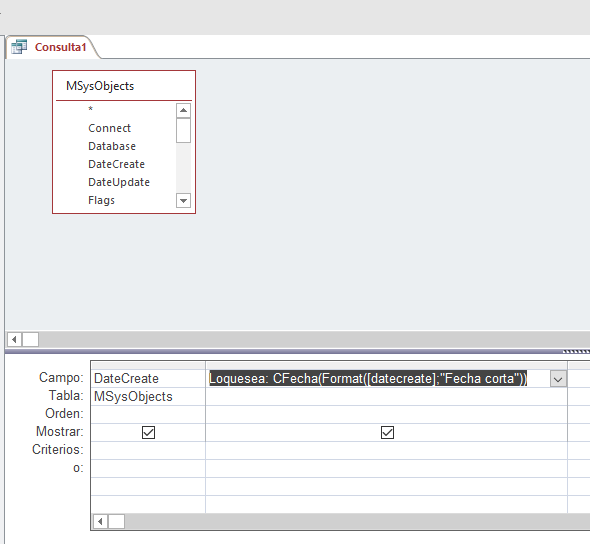Acontece que tengo en mi base de datos la tabla maestra que se llama MsysObject la cual en el campo DateCreate y DateUpdate muestra la fecha con hora, pero al listar solo quiero ver la fecha sin hora y que no sea dato texto corto sino date, como le puedo hacer ahi a esa parte porque luego trabajo con dos funciones publicas en dicha consulta que son tipo dato date pero no me da.