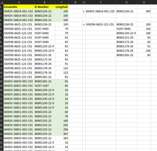 Busco sacar el resultado como se muestra en las columnas F, G, H, ya que en las columnas A tengo datos repetidos y en la columna B igual pero estos varían pero como se muestra en la línea F5 la cual estrae el repetido de la A, y en la G5 a G12 solo extrae los dublicados correspondientes a B5, B17 para después hacer la suma de la distancia.