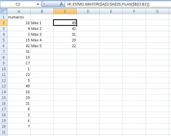 Tengo una columna de números, quiero obtener los 5 mayores de esa columna