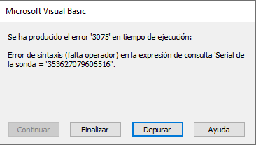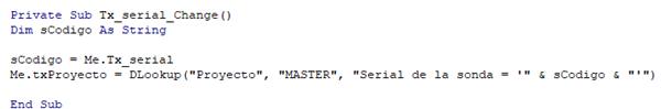 Tengo un formulario en el que estoy haciendo un buscarv para que me traiga el campo que coincide con los criterios de la búsqueda, el campo del serial se llama Tx_serial y el del proyecto se llama txProyecto, el campo de la tabla que busco se llama Serial de la sonda y el que quiero que me muestre en el campo proyecto se llama Proyecto, pero me sale el siguiente error y no sé cómo arreglarlo.