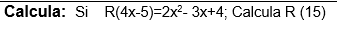 MatemáticasCálculo Clazb Live el 7 sep. 20 Aplica las propiedades de los polinomios Seguir Siguiendo Dejar de seguir 1 respuesta Respuesta de albert buscapolos Ing° 0 0 albert buscapolos Ing°, Me retiro gradualmente del Foro. Gracias a todos !! . ALBERT ING. No se entiende muy bien el enunciado. Pasándolo en limpio sería:R(15) = R( 4x - 5) ............ 4x - 5 = 15 ............x= 20/4 = 5Luego el polinomio quedaria como ..........R(15) = 2 X 5^2 - 3 X 5 + 4 = 50 - 15 + 4 = 39. el 7 sep. 20 - Anónimo ahora mismo Añadir comentario Usa los comentarios si quieres aportar algo a esta respuesta. No los utilices para preguntar algo nuevo. Cancelar Enviar