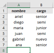 Deseo que en la lista desplegable solo estén las personas que tienen cargo de "senior" o "semi". En este caso la lista desplegable quedaría con los nombres de ariel, diego, juan y ana.