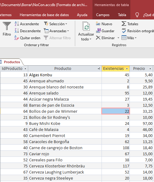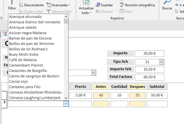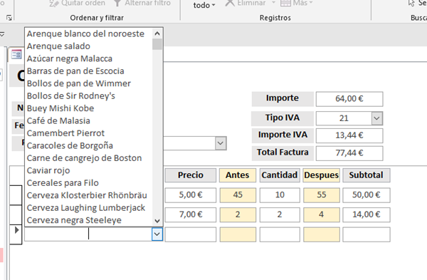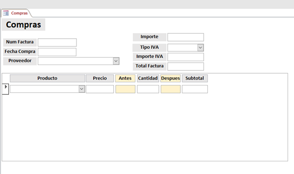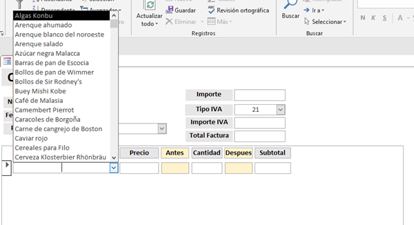 Cuando abro el formulario Compras en un registro nuevo, primero borra lo que hubiera en la tabla Aux, luego inserta en ella todos los productos de la tabla Productos de forma que cuando pongo el cursor en el combinado