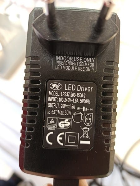 Tengo una lámpara de pie Led con una lámpara de 18W y otra de 5W. Se conecta a la Red mediante un alimentador con entrada de 230V y salida de 20V 1.5A