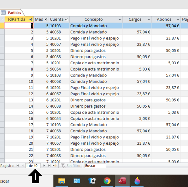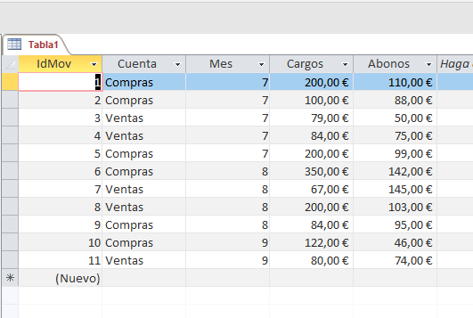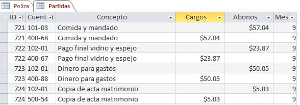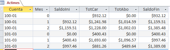 En Access, uso la tabla "Partidas", que contiene la actividad de la cuenta por cada transacción, y el mes en que ocurrió la transacción. Te envío una muestra: De esta tabla, quiero crear una nueva que contenga para cada cuenta y mes: el saldo inicial, total de cargos, total de abonos y saldo final.