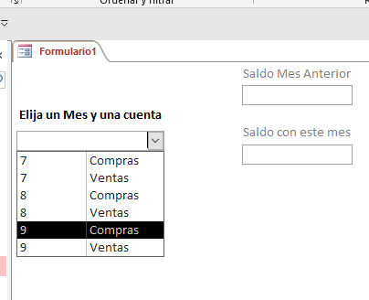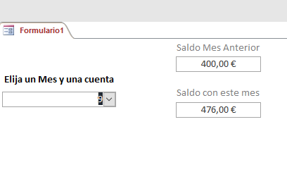 Y tengo un formulario con un cuadro combinado donde elijo el mes y la cuenta, y dos cuadros de texto, que me van a presentar el "Saldo" de esa cuenta hasta el mes anterior y el saldo contando ese mes