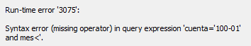 MesAnterior = DSum("nz([cargos])", "tabla1", "mes<" & Me.ElegirMes & " and cuenta='" & Me.ElegirMes.Column(1) & "'") - DSum("nz([abonos])", "tabla1", "mes<" & Me.ElegirMes & " and cuenta='" & Me.ElegirMes.Column(1) & "'")