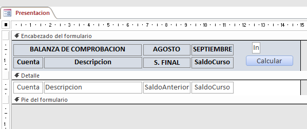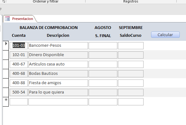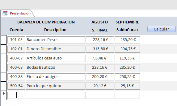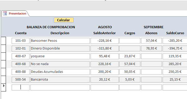 Mil gracias por tu respuesta. Quiero crear lo que en contabilidad se llama balanza de comprobación; te muestro la que llevo en Excel y que quiero replicar en Access: