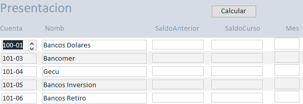 Seguí las instrucciones que me diste: cree la tabla Presentacion y con base en ella un formulario. al cargarlo, la tabla se llena adecuadamente con todas las cuentas y nombres y el formulario las muestra: