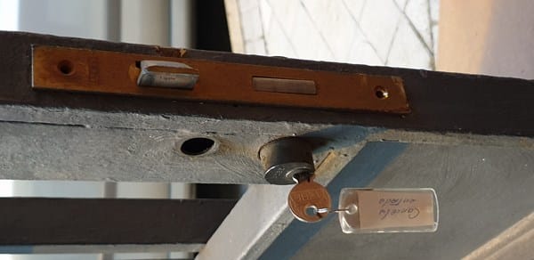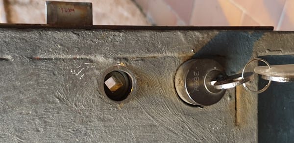 Necesito cambiar la cerradura entera de una puerta metálica, ya que se ha roto. El problema es que no veo ni encuentro el tornillo que suelta el bombín, y no puedo sacar la cerradura completa de la puerta. Adjunto unas fotos por si alguien sabe cómo se puede sacar.