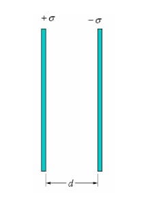 Se tiene dos planos conductores infinitos paralelos separados una distancia d, uno con densidad de carga +σ y el otro con densidad de carga −σ.