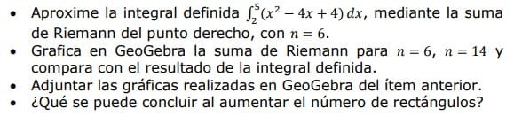 MatemáticasCálculoCiencias e Ingeniería oscar carreño el 25 sep. 20 Desarrollar el ejercicio seleccionado utilizando las Sumas de Riemann: Buenas noches compañeros espero me ayuden con ete ejercicio Seguir Siguiendo Dejar de seguir