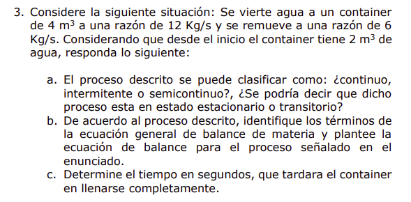 Considere la siguiente situación: Se vierte agua a un container de 4 m3 a una razón de 12 Kg/s y se remueve a una razón de 6 Kg/s. Considerando que desde el inicio el container tiene 2 m3 de agua, responda lo siguiente: