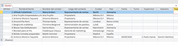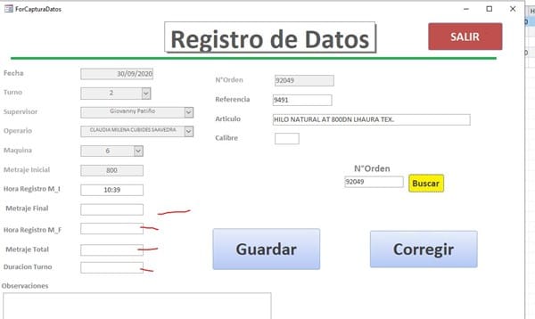 Private Sub Comando91_Click() DoCmd.SetWarnings False If Not IsNull(fecha1) And Not IsNull(orden1) And Not IsNull(supervisor1) And Not IsNull(turno1) Then DoCmd.RunSQL "Insert into dbo_CapturaDatos (Fecha,Turno,Supervisor,Operario,Maquina,OrdenFabricacion,Referencia,Articulo,Calibre,Metraje_Inicial,HoraRegistro_Metraje_Inicial,Metraje_Final,HoraRegistro_Metraje_Final,Metraje_Total,Duracion_Turno,Observaciones) Values (fecha1,turno1,supervisor1,operario1,maquina1,orden1,referencia1,articulo1,calibre,metrajei1,registro1,metrajef1,registrof1,TotalMetraje,duracion1,observaciones1)" MsgBox " Se Guardo el Registro" fecha1 = Null turno1 = Null supervisor1 = Null operario1 = Null maquina1 = Null orden1 = Null referencia1 = Null articulo1 = Null calibre = Null metrajei1 = Null registro1 = Null metrajef1 = Null registrof1 = Null TotalMetraje = Null duracion1 = Null observaciones1 = Null fecha1.SetFocus fecha1.BackColor = vbWhite turno1.BackColor = vbWhite supervisor1.BackColor = vbWhite orden1.BackColor = vbWhite Me.registro1.Enabled = True Me.registrof1.Enabled = True Else If IsNull(fecha1) Then fecha1.BackColor = vbRed Fecha1. SetFocus ElseIf IsNull(turno1) Then turno1.BackColor = vbRed Turno1. SetFocus ElseIf IsNull(supervisor1) Then supervisor1.BackColor = vbRed Supervisor1. SetFocus ElseIf IsNull(orden1) Then orden1.BackColor = vbRed orden1.SetFocus End If End If End Sub