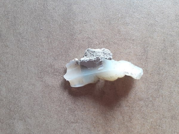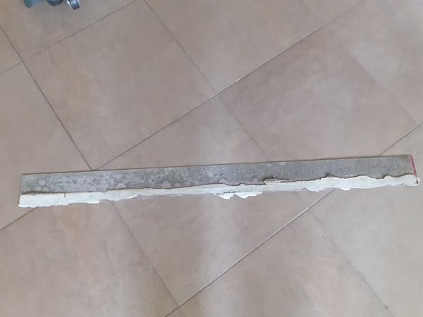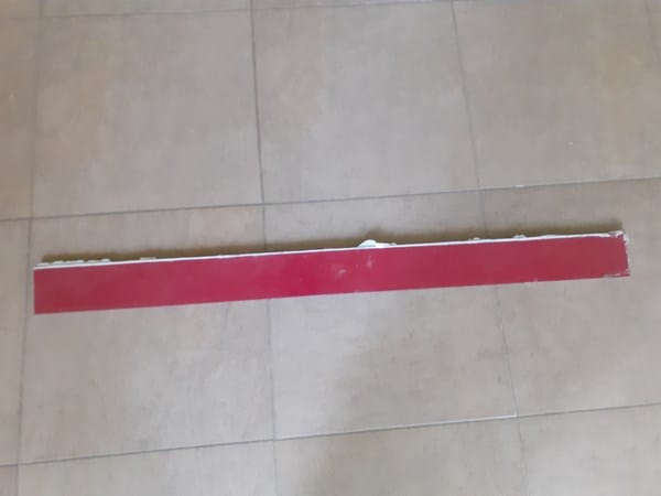 En la parte externa de una caja de persiana iba pegada sobre el marco de madera una lámina de PVC, de unas dimensiones de 104x8 cm y unos 3-4 mm de grosor. La parte pegada al techo de madera tan solo eran 3 cm de los 8 cm de ancho.