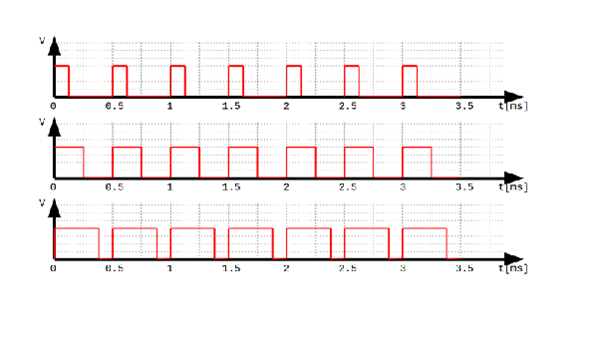 La principal diferencia con el tren de pulsos es que en la señal PWM, es posible variar el tiempo que la señal se mantiene en estado alto, pero siempre manteniendo el periodo constante, tal y como se muestra en la imagen siguiente.