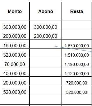 En la imagen se observa el formato. Deseo introducir 1.670.000,00 en la celda señalada y que automáticamente haga la resta hasta saldar el último monto.