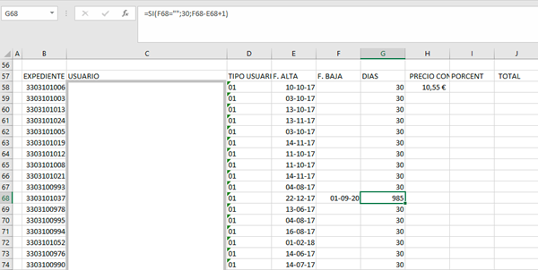 Pero si hay fecha de baja ya no me sirve porque me calcula los días desde que lleva de alta entonces supongamos que tendría que calculármelo sobre el día 1 de cada mes en el que se da de baja. Pôr ejemplo la G65 me calcula 985 días y deberían de ser como yo quiero 1 día porque esto corresponde a Septiembre. ¿Cómo puedo crear esa fórmula?