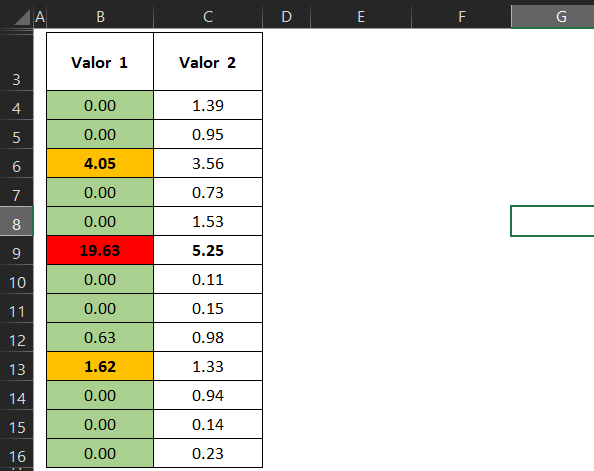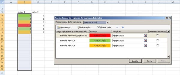 Ojala me puedan ayudar, tengo un cuadro en excel con 02 columnas, donde deseo aplicar el formato condicional en la columna B (Valor 1). Lo cual consiste que, si valor 1 es menor a valor 2 se me pinte la celda de color verde, si valor 1 es mayor a valor 2 se me pinte la celda de color amarillo pero teniendo en cuenta que el valor máximo se pinte de rojo también así como muetro en la imagen.