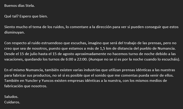 Vivo en una localidad de Toledo, en la cual hay un polígono industrial pequeño a un kilómetro y medio de distancia de donde yo vivo, en el centro del núcleo urbano. El caso es que hay, desde hace ya años, una fabrica de prensa que se tira prácticamente las 24 horas haciendo funcionar una maquina que hace unos ruidos atronadores, por el día ni siquiera llegan a apreciarse, la verdad sea dicha, por el resto de sonido pero al estar toda la noche también en el silencio los estruendo llegan hasta mi casa, donde al ser una vivienda alta llegan de lleno desde lo