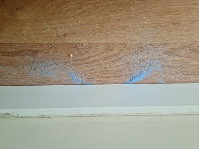 En la reforma coloqué espuma aislante azul y tarima del Leroy Merlín, desde hace un tiempo en algunas zonas de la vivienda, principalmente en el pasillo ha comenzado a aparecer polvo azul como soplado por algún punto concreto debajo del rodapié, se limpia y vuelve a aparecer y este verano ha ido a más.