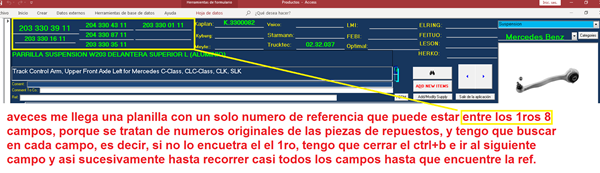 El tema es el siguiente, tengo una base de datos de repuestos para autos, el cual se compone de 12 campos alfanuméricos donde cada campo en ciertos casos se completan desde 1 campo hasta 12, dependiendo del articulo, para ser mas especifico, el articulo llamado bomba de agua w123 tiene como referencias 5 números de piezas que corresponden al mismo articulo, y el problema se da que cuando uso el buscador (Ctrl+B), este solo busca en el campo donde se posiciona el cursor, lo que yo pretendo es que cuando active Ctrl+B o algún menú de búsqueda por programación, al introducir el numero de pieza lo busque solamente en los campos que mencione anteriormente, es decir los campos donde solo cargos los números de piezas y sus referencias.