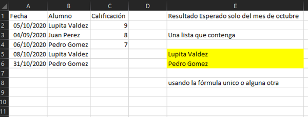 Tengo una lista que siempre está cambiando de alumnos, necesito usar la función de únicos para que de la lista general se ponga una lista de valores únicos con los alumnos, pero que solo se pongan los alumnos con determinada fecha, ejemplo: