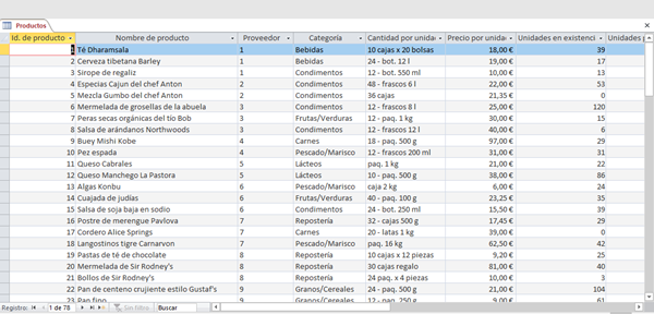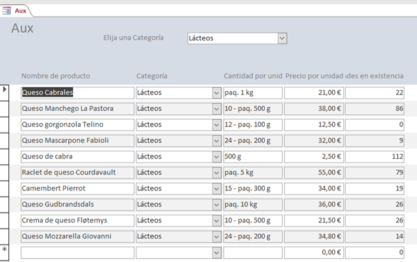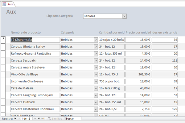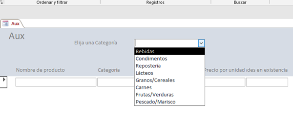 Y tengo un formulario basado en la tabla Aux( por comodidad le he puesto los mismos nombres de campos pero pueden ser cualquiera). También le he añadido un combinado( aunque tampoco sería necesario, ya que se le podría decir en código el criterio que se quiera) para seleccionar un tipo de productos, los pertenecientes a la categoría de Bebidas