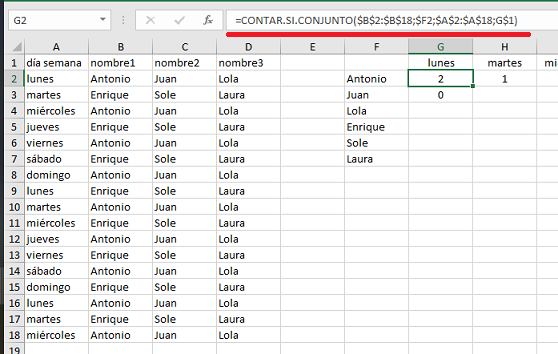 Tengo 3 columnas B, C y D con nombres con con distinto número de repeticiones, hasta la fila 15 y en la columna A tengo el día de la semana,