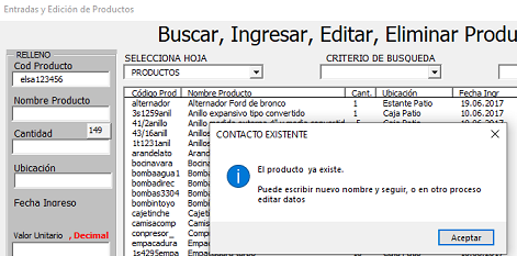 MsgBox = "este nombre ya existe" Aceptar Sale de la macro, limpiando SOLO el TextBox Nombre producto.