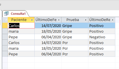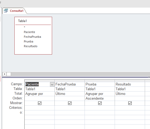 Quiero hacer una consulta en la que me de, para una prueba en concreto, el ultimo resultado de la misma de todos los pacientes. Hago una consulta de totales con el valor cuenta en nombre; en prueba pongo la que quiero que salga y en fecha pongo Max. El resultado es que los pacientes que tienen distinto resultado en la prueba lo saca dos veces.
