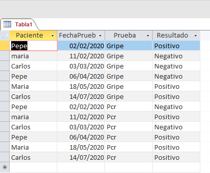 Tengo 2 tablas: una de pacientes y otra de pruebas que se realizan con la fecha y el resultado de las mismas (el resultado es siempre o POSITIVO o NEGATIVO)