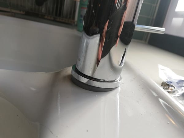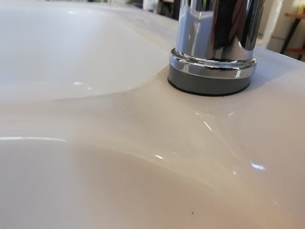 He comprado un fregadero cerámico Roca Leman y resulta que la superfice donde se coloca el grifo, es una superficie inclinada y al colocar el grifo se queda muy inclinado hacia adelante y se ve muy feo. De momento lo hemos resuelto limando un trozo de tubo de pvc en forma de cuña que corrija la inclinación y haga que el apoyo del grifo sea horizontal, pero la verdad es que la pieza de pvc se ve muy fea entre la cerámica blanca y el metal del grifo.